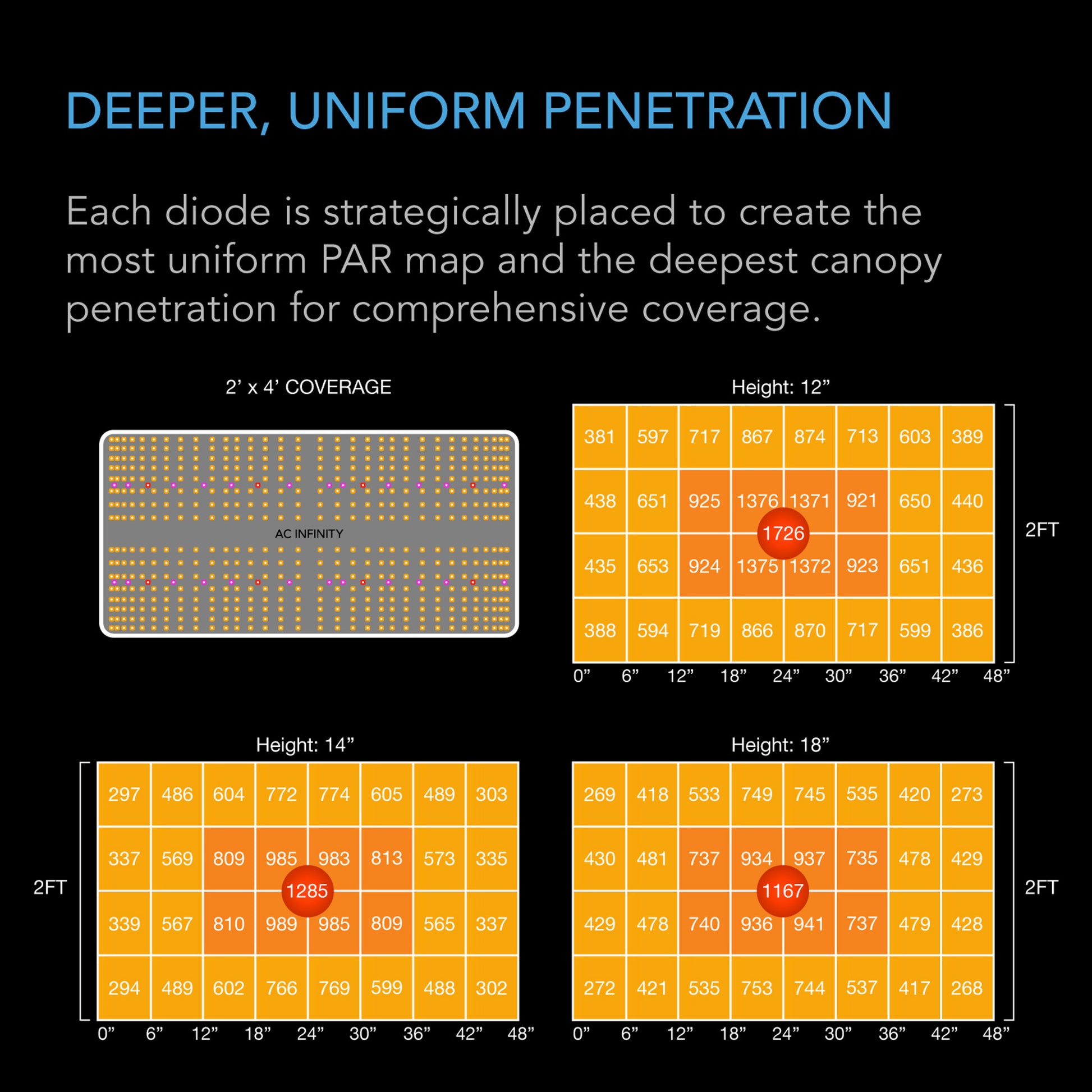 - Algorithmically positioned diodes create the most uniform PAR map and the deepest canopy penetration.
