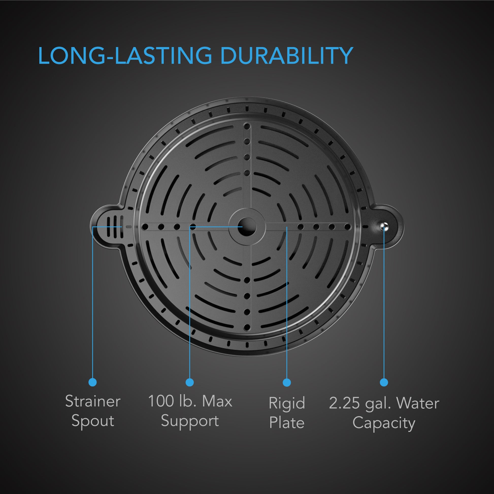 - Included gauge displays the current water level while the strainer spout enables quick replenishment.